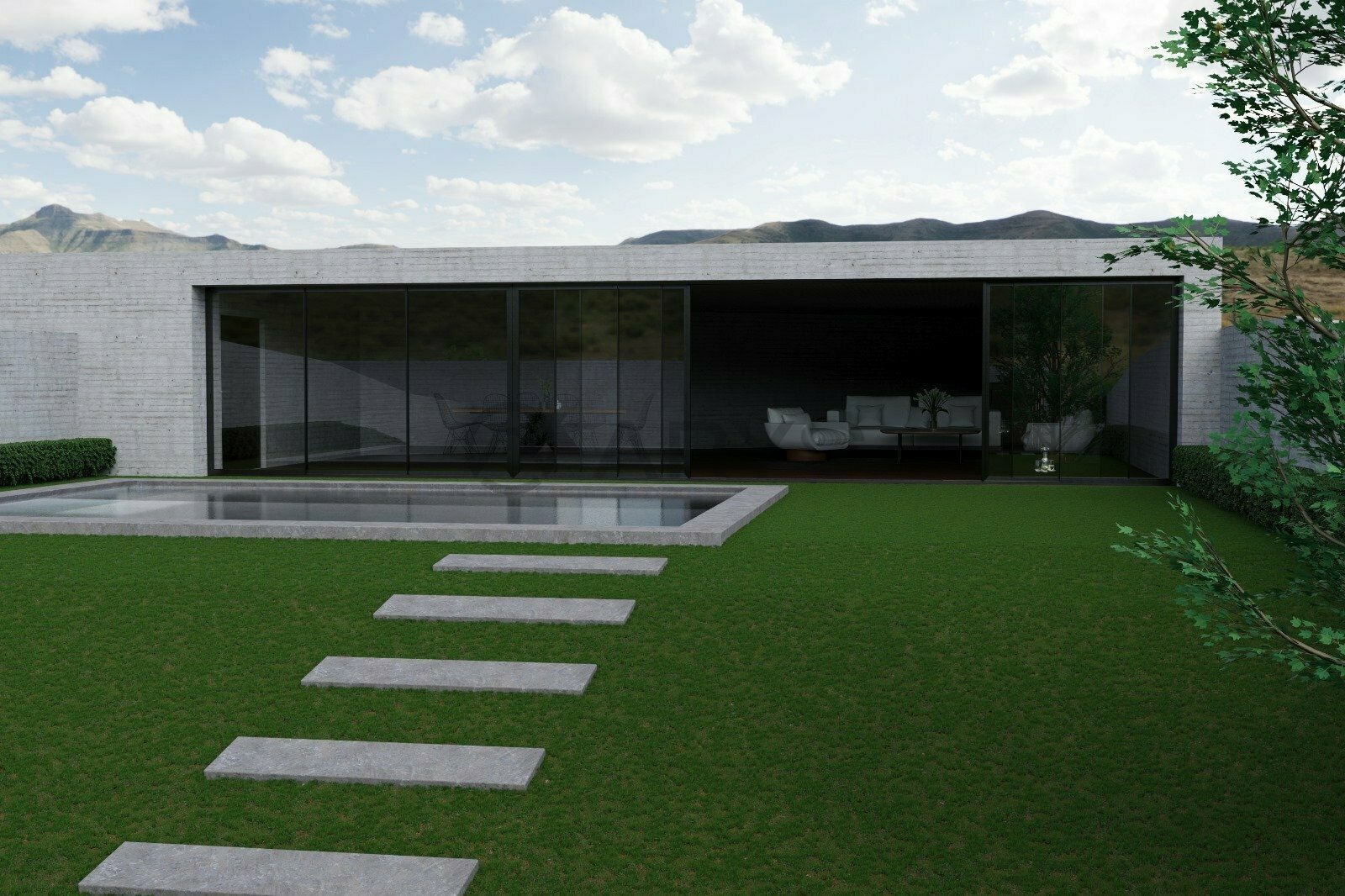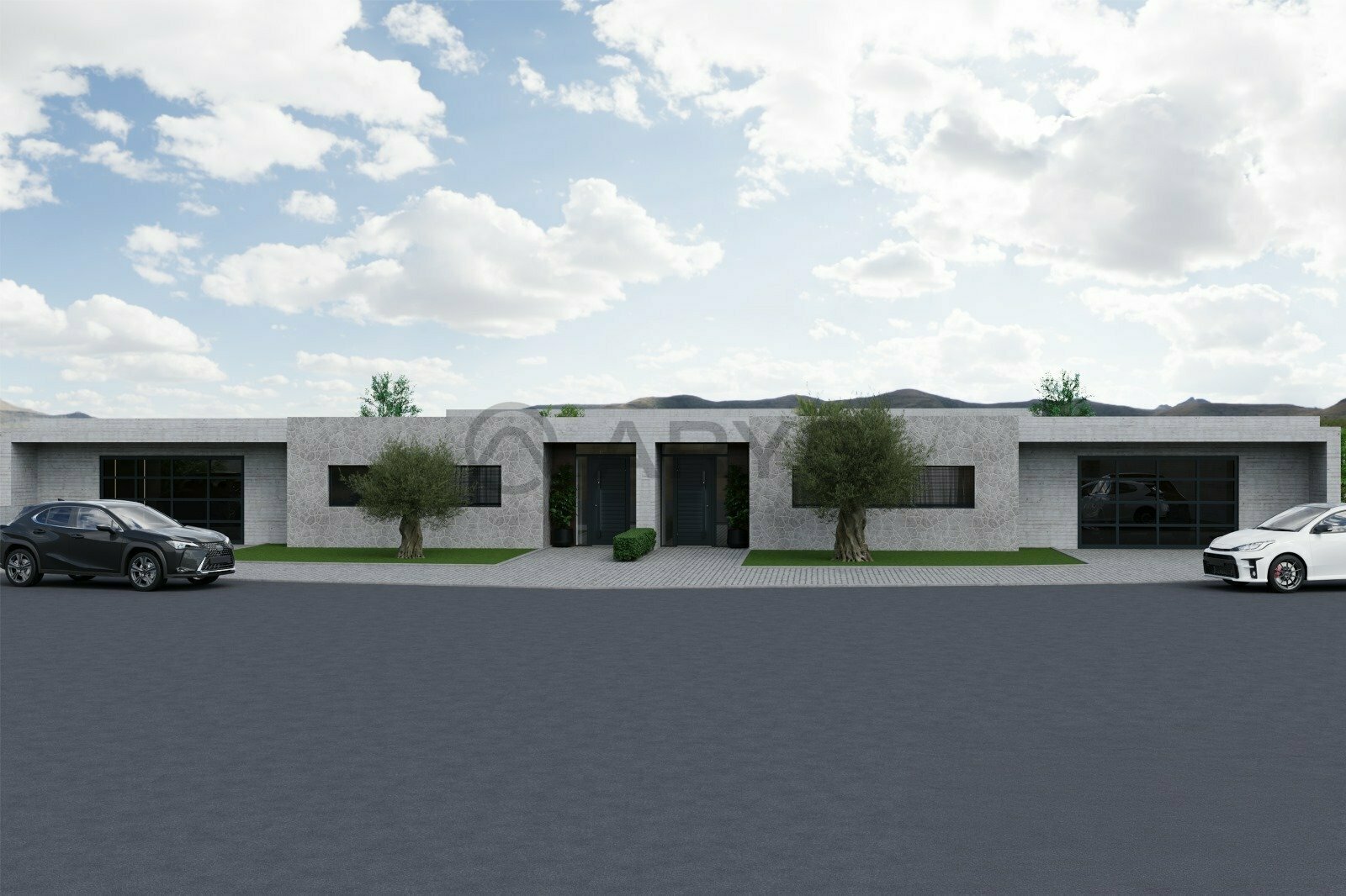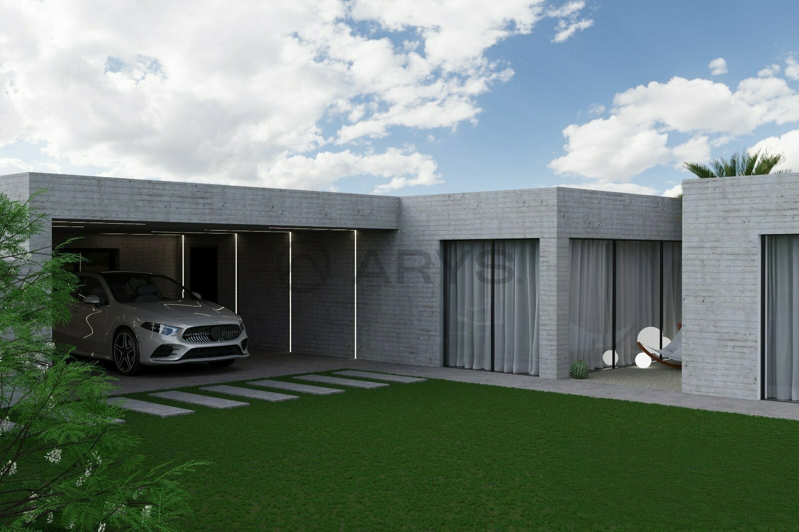 Une maison de plain-pied avec une façade en granit et béton, conçue pour offrir le refuge que toute maison se doit d'offrir.
